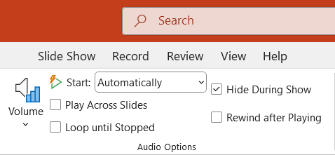 Recording or adding an audio file to a PowerPoint slide adds a speaker icon to the slide which contains the audio player controls. Select the speaker icon and move to the Playback tab. For video export purposes, ensure Start is set to Automatically and check Hide During Show to hide the icon on the slide.