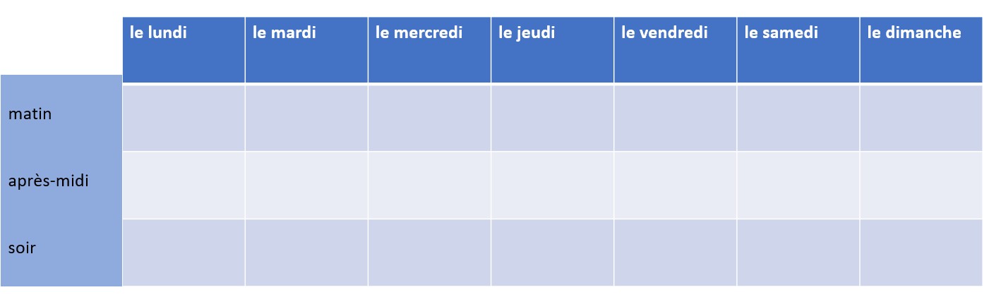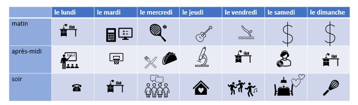 Voici la semaine typique d’Alex. Posez des questions et décrivez sa semaine comme le modèle.