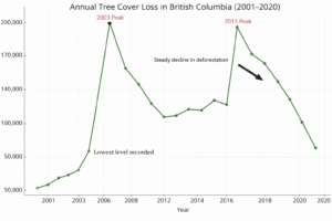 Deforestation in British Columbia (BC) is an ongoing issue that sits at the intersection of environmental protection, economic activity, and resource management. As one of the most heavily forested regions in Canada, BC plays an important role in timber production while also supporting biodiversity, carbon storage, and ecosystem services. Decisions related to forest use therefore have consequences that extend beyond a single sector, affecting ecological health, local communities, and long-term sustainability. Examining specific moments within deforestation data can help foreground how forest systems respond to changing conditions.