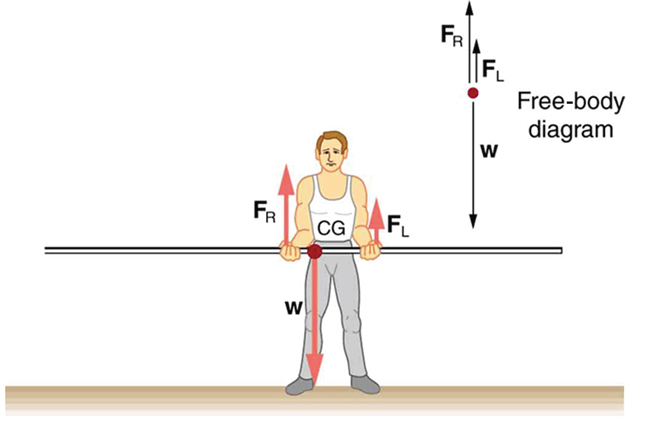 In Figure 1, a pole vaulter holding a pole with its cg halfway between his hands is shown. Each hand exerts a force equal to half the weight of the pole, FR = FL = w/2. (b) The pole vaulter moves the pole to his left, and the forces that the hands exert are no longer equal. See Figure 1. If the pole is held with its cg to the left of the person, then he must push down with his right hand and up with his left. The forces he exerts are larger here because they are in opposite directions and the cg is at a long distance from either hand.