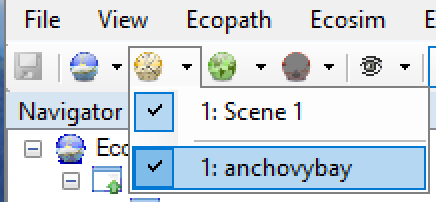 To evaluate the impact of marine mammals, load the model. You can simultaneously load the one scenario and time series file in the model, from the top menu as shown in Figure 1. Just click 1: anchovybay, i.e. the time series, (which also loads the Scene 1 scenario).