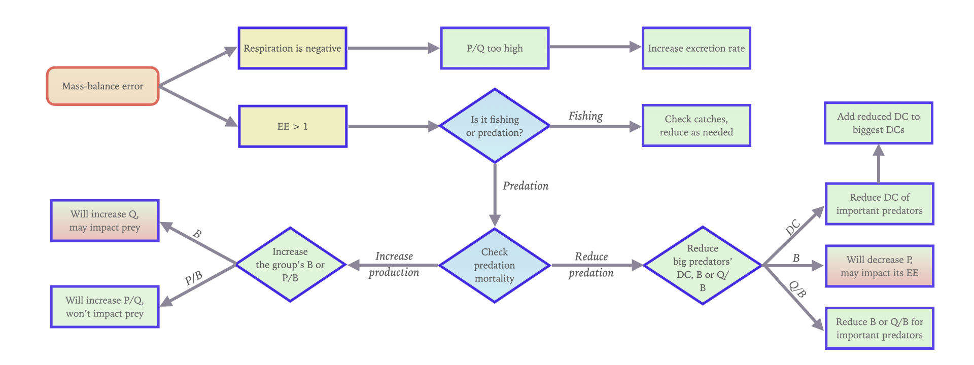 Earlier versions of EwE (5) had an automatic mass-balance routine.[4], but we have not migrated that utility to later versions. The reason for this is GIGO = Garbage in, Garbage out. Input parameters have to checked carefully before doing mass-balance, one has to weed out error, such as notably unit conversion errors. Our experience is that that process cannot be automated. (But it was a nice and elegant routine).