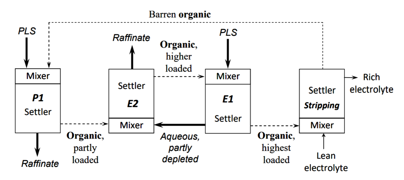The countercurrent mode illustrated in Figure 10 is sometimes called series extraction. In copper SX two or three extraction stages in series is typical. More recently a new configuration has been applied, called series-parallel extraction (Davenport et al. 2002). In this arrangement, there are three extraction stages. Briefly, the barren organic from stripping enters stage 3 and is contacted with a fraction of the PLS solution (the PLS is split into two streams). The exiting aqueous solution is a raffinate stream (only one contact with organic). The partially loaded organic proceeds to stage 2, and after copper extraction, it enters stage 1. The remaining PLS enters stage. Due to its relatively high copper concentration it enhances organic loading of copper considerably. The aqueous exiting stage 1 and the organic exiting stage 3 are mixed in stage 2. A second raffinate stream exits stage 2. Stages 1 and 3 operate in parallel, both using PLS. Stages 1 and 2 act in series.
