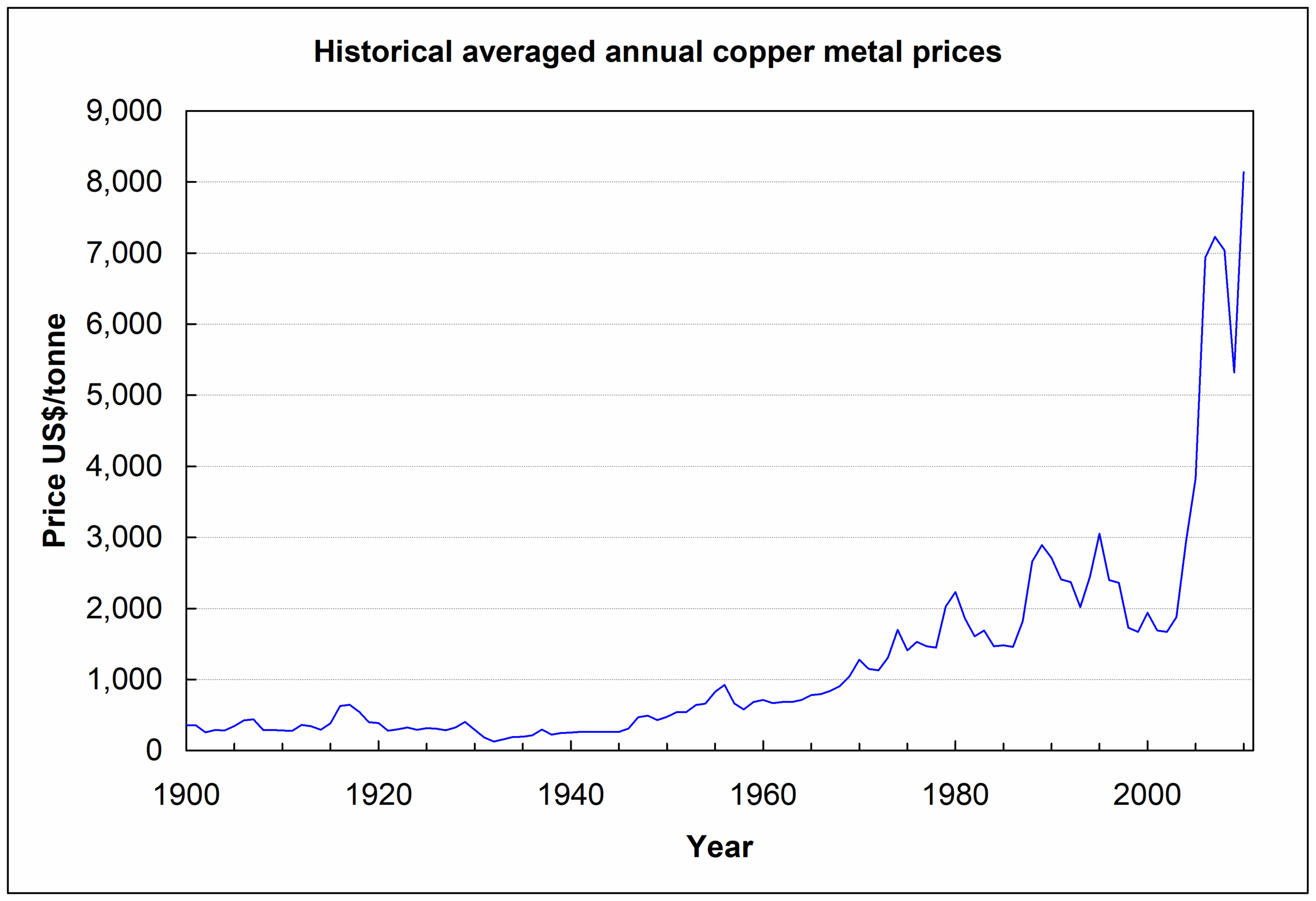Metals prices fluctuate significantly with time for a variety of reasons. There are periods of boom and bust in the metals business. It takes several years to finance and build a large metal production plant and a year or so to get it to full production. Thus there can be significant lags between supply and demand changes. Variations in prices of copper are indicated in Figure 5, which shows the average annual price of copper in the U.S. since 1900. The major decline starting in 1995 saw a drop in prices of about 40% in just three years. Of late copper prices have soared. At this writing copper prices are exceeding $9,000/tonne. This may be due in part to speculation of the sort that affects gold prices.