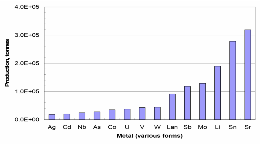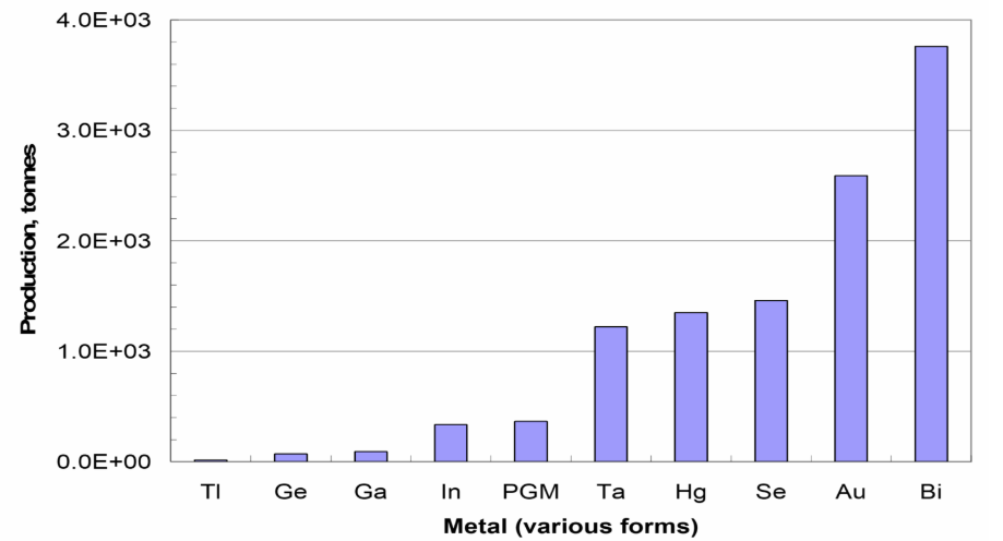 The range of value of metals is illustrated in Figure 4. Platinum group metals (PGM’s: Ru, Os, Rh, Ir, Pd and Pt) are among the most expensive and rare. (Typically, platinum is more expensive than palladium.) The cost of rhodium in 2000 was about $64,000/kg ($1990/troy ounce). The highest tonnage metals are among the cheapest, which makes sense. Some metals are produced only as by-products of other metal production processes. For instance, no ores are mined primarily for thallium, which has become very valuable of late due to its use in electronics, e.g. large-screen TVs. Thallium is produced as a by-product of copper, lead and zinc sulfide ores processing. By-product metals may range greatly in value. Platinum group metals and gold are often recovered as by-products, for instance of copper or nickel/cobalt production. (They are also recovered from ores mined primarily for this purpose.) By-product metals sometimes have to be produced even if they are of little value, for instance due to toxicity that does not permit easy disposal.