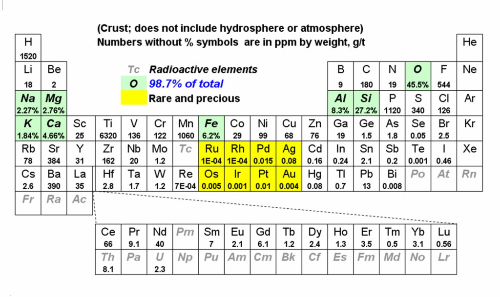 Table 1 shows the natural abundances of many commercially important metals and elements in the lithosphere. Most of the Earth’s crust is composed of oxygen (45.5%), silicon (27.2%), aluminum (8.3%), iron (6.2%), calcium, magnesium, sodium and potassium; these 8 elements comprise about 99% of the earth’s crust! Most of the transition metals and the other heavier metals are either rare or very rare, with a few exceptions (iron, titanium and manganese – among the earlier of the transition metals). Natural abundances are also illustrated in the form of a periodic table in Figure 7. Note that often the lighter elements are the more common, while the heaviest transition metals are relatively rare. Indeed the platinum group metals, gold and silver are among the very rarest elements. There are exceptions to the general rule. The lanthanides (also called the rare earths) are not actually all that rare, compared to some of the less abundant transition metals.