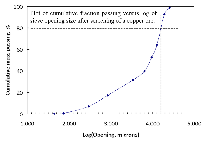 The P 80 size is indicated on the diagram: log(opening) = 4.2; opening = 104.2 = 15,850 μm = 1.59 cm. This means that 80% of the sample is less than 1.59 cm in size.