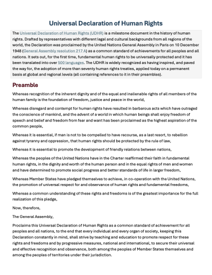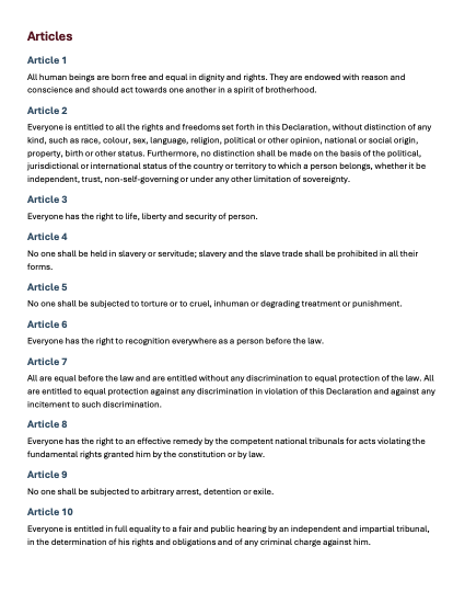 Proclaims this Universal Declaration of Human Rights as a common standard of achievement for all peoples and all nations, to the end that every individual and every organ of society, keeping this Declaration constantly in mind, shall strive by teaching and education to promote respect for these rights and freedoms and by progressive measures, national and international, to secure their universal and effective recognition and observance, both among the peoples of Member States themselves and among the peoples of territories under their jurisdiction.