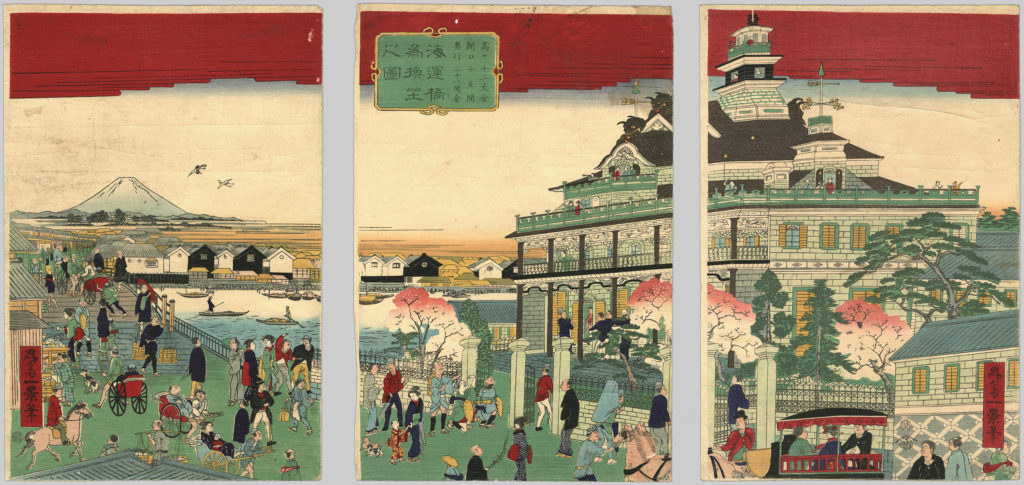 The Meiji Government erected Western-style buildings to appeal to Western countries in the hopes of revising unequal treaties, requiring the construction of authentic Western architecture. That plan would come to fruition with the Rokumeikan, or “Deer Cry Pavilion,” completed in 1883. In other words, Government-sponsored buildings gradually transitioned from pseudo-Western Giyōfū architecture designed and constructed by Japanese carpenters or hired foreign advisors (oyatoi),[11] to more authentic Western architecture. Urban residents, on the other hand, commissioned Giyōfū-style structures from craftspeople who eagerly embraced Western cultural influences instead of rejecting them. As a result, new techniques adopting new forms without hesitation and allowing new and old forms to coexist began appearing in the urban space of Tokyo. The Tōkyō Gōshō Sugoroku gives us a visual depiction of this mixing of Western and Japanese styles in early Meiji Tokyo.
