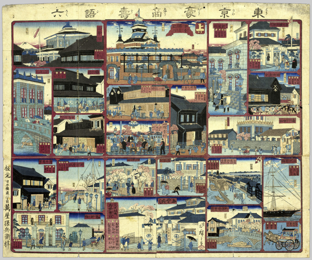 First, a detailed look at the Tōkyō Gōshō Sugoroku. In each of the game squares, we can see a number of building types no longer present in Tokyo – castellated buildings, roofs adorned with mythical sea creatures (shachi), or the plastered warehouses and Western-style brick buildings lining the Ginza. Labels identify the names and addresses of companies new to Tokyo at the time. Starting from the Kawase Gaisha commercial exchange in the bottom-central furidashi square, players roll the dice to reach the First National Bank in the agari square at the top-center. Notice the label in the Kawase Gaisha square locating the building in Moto-Ōsakachō [Figure 1], a commoners’ neighborhood from the Edo-period that disappeared in 1933 as part of the Imperial Capital Reconstruction Project following the Great Kantō Earthquake (now part of Nihonbashi Ningyōchō). A number of theories exist for the origin of the neighborhood’s name, but it is thought it derives from the granting of the land to merchants who moved from Ōsaka during the Tenshō Era (1573-1592), with “Moto” added to distinguish the area from nearby Shin-Ōsakachō (now Nihonbashi Tomizawachō).[3]During the Edo Period, the urban space of Edo was made up primarily of samurai areas (bukechi), commoner areas (chōninchi), and temple and shrine lands (jishachi). According an 1869 survey, bukechi made up 68.6%, or 9,585 acres, of the urban area of Edo, with the remainder split evenly between chōninchi (15.8%) and jishachi (15.6%).[4] It is possible, moreover, to roughly define a typical pattern of buildings that would have stood in each of these areas.