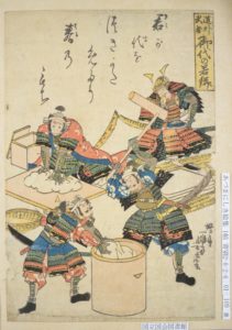 The print features Oda Nobunaga and Akechi Mitsuhide pounding the rice into dough, Toyotomi Hideyoshi making the dough into mochi, and Tokugawa Ieyasu relaxing and eating the product of the labor of the others. In other words, the print could be interpreted as belittling Tokugawa Ieyasu’s accomplishment in forging a unified Japan.
