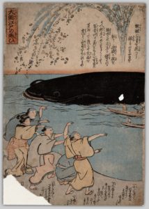 This complex print in Figure 6 depicts people seeking the prosperity that became apparent in the wake of the 1855 Ansei Edo earthquake. Notice several points. First, catfish do not have blowholes. Second the blowhole of whales is located atop their heads, not in the middle of their bodies.