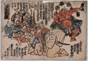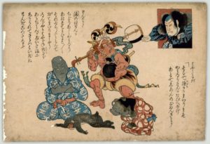 Figure 14 is based on the Yukashita (below the floor) scene from the Kabuki drama Meiboku sendai hagi 伽羅先代萩. In the original, the scene involves Arajishi Otokunosuke wounding a large rat, which escapes and re-emerges as the arch villain Nikki Danjō. In the print, Arajishi transforms into Araishi Kanamenosuke 荒石要之助, that is, the Kashima deity, and the rat has become a gourd.