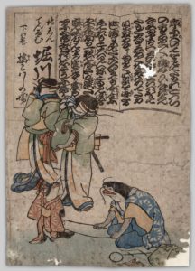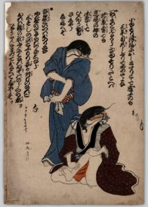 Because of the near total destruction of the Yoshiwara area, the bakufu authorized the opening of numerous temporary brothels around Edo. Many earthquake prints used these places as their setting and often depicted newly-rich construction workers spending money there. Overall prints from the Ansei Edo earthquake tended to interpret the significance of the event as a cosmically ordained shakeup of society such that money flowed from the coffers of the rich (daimyo and wealthy merchants) into the hands of hardworking laborers. The usual term for this redistribution of wealth in the context of the Ansei Edo earthquake was yonaoshi 世直し, literally “rectification of society.” This term might have other meanings, for example redress of peasant grievances, in other late Tokugawa era contexts.