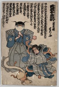 Figure 18 is the left page of a two-page print entitled Yomunasake ukiyo arisama 夜無情浮世有様, which is a play on the title of the Kabuki drama Yowanasake ukina no yokogushi 与話情浮名横櫛. The print depicts the Genjidana 源氏店 scene. On the missing (right) page is the Kashima deity, derived from Tazaemon (manager of a successful, large shop) in the original. Yosaburō (a young man living a debauched lifestyle) in the original is the standing catfish in the half of the print depicted here. Kōmori Yasu (Yasu-the-bat), a man with a tattoo of a bat on his cheek, is the seated catfish. This print is yet another example of taking famous Kabuki scenes and refitting them with earthquake-themed text and images.