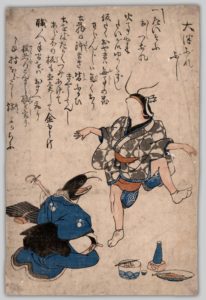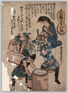 Here in Figure 8, anthropomorphic catfish perform the song “Earthquake Suchyaraka-bushi” in an irreverent parody. The catfish are dressed as fire fighters, and their water barrel is labeled “Kashima-chō” (Kashima lies to the northeast of Edo). Suchyaraka-bushi was a popular song from the Kabuki stage. In the earthquake version, the first half of each line describes a situation and the last half indicates the location of the person or people in question.