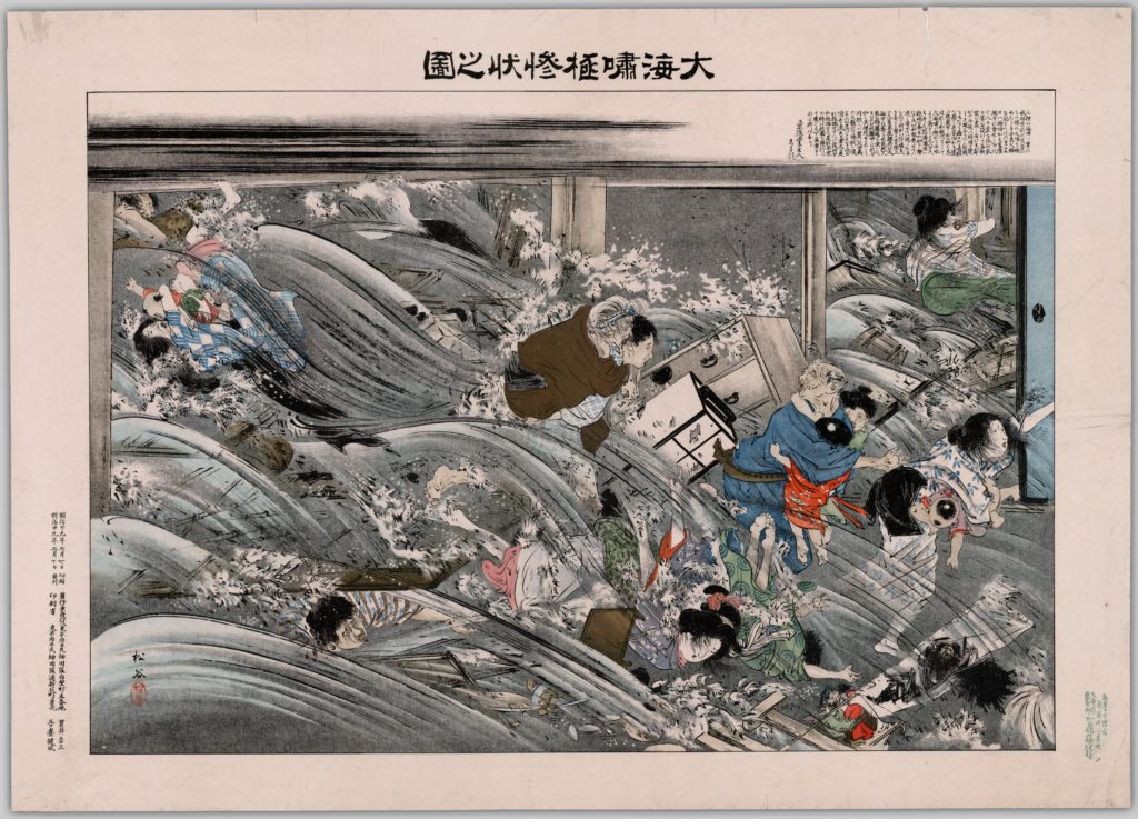 Contrast the catfish prints with disaster prints 7, 9, and 10 in the UBC Open Collections [Figures 1.1, 1.2, and 1.3]. These three prints are attempts realistically to depict the horrors of the 1896 Meiji Sanriku tsunami. This tsunami devastated the Sanriku coast (approximately the same area devastated in 2011), killing over 20,000. These prints succeed in conveying some sense of the disaster, but there is little to analyze about them beyond certain technical features. The 1855 catfish prints, by contrast, are rich in symbolic social commentary, often in multiple layers.