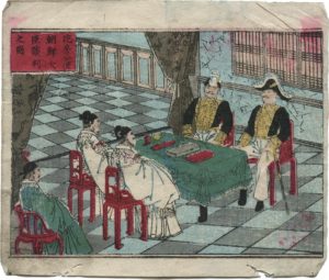 Similarly, while earlier the empress had been depicted as a Heian beauty with her face averted [Figure 6], in the 1883 version she stares straight out at the viewer. But most remarkable of all is the frontispiece, which shows Ambassador Hanabusa Yoshitada negotiating with the Korean prime minister while the king of Korea is shown in the background [Figures 11 and 12]. This is presumably the Treaty of Chemulpo (1882), which established a permanent garrison of Japanese troops in the Korean capital.