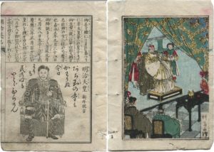 The Meiji Eimei Hyaku’ei Sen was also reprinted, in 1883, also in metal type in small format. There are interesting differences between the illustrations, however. While in the earlier work the Meiji emperor was hidden by a blind and on traditional tatami [Figure 5, above], in the 1883 edition he is in full Western military uniform and seated on a chair, presaging Edoardo Chiossone’s famous portrait of 1887 [Figure 12].