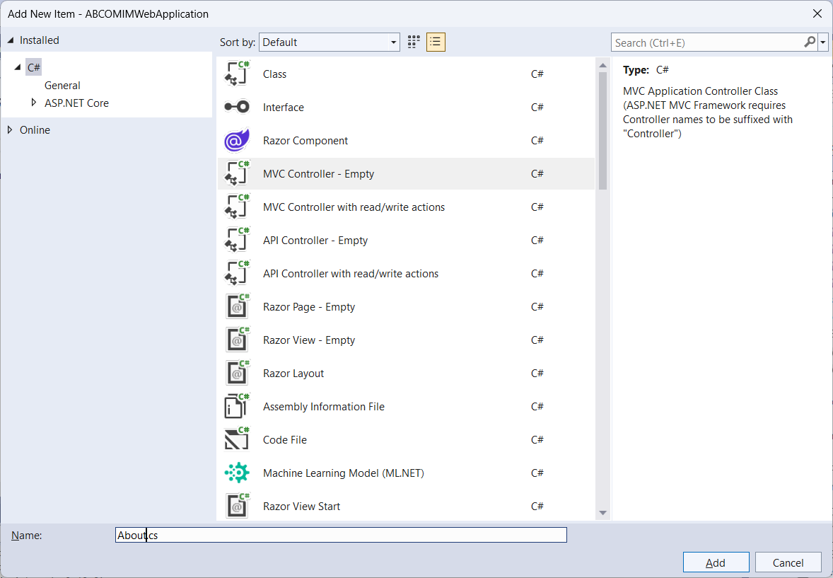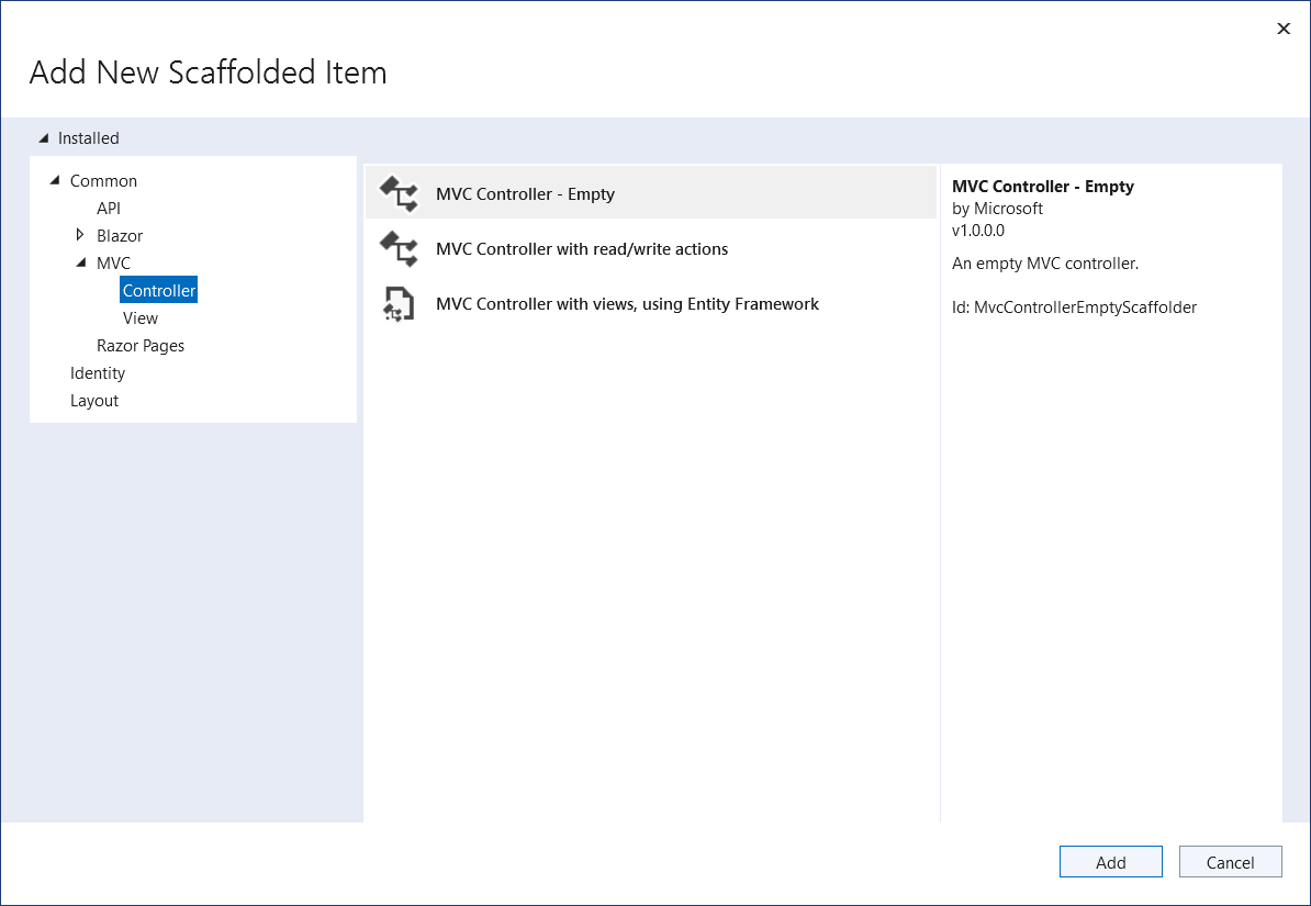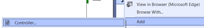 So far, we have the models and the views. We need to add a MVC Controller in order to make our program work. To do so, we need to do a right mouse click on the Controllers folder and then select Add => Controller from the context menu, as shown in Figure 15.79.