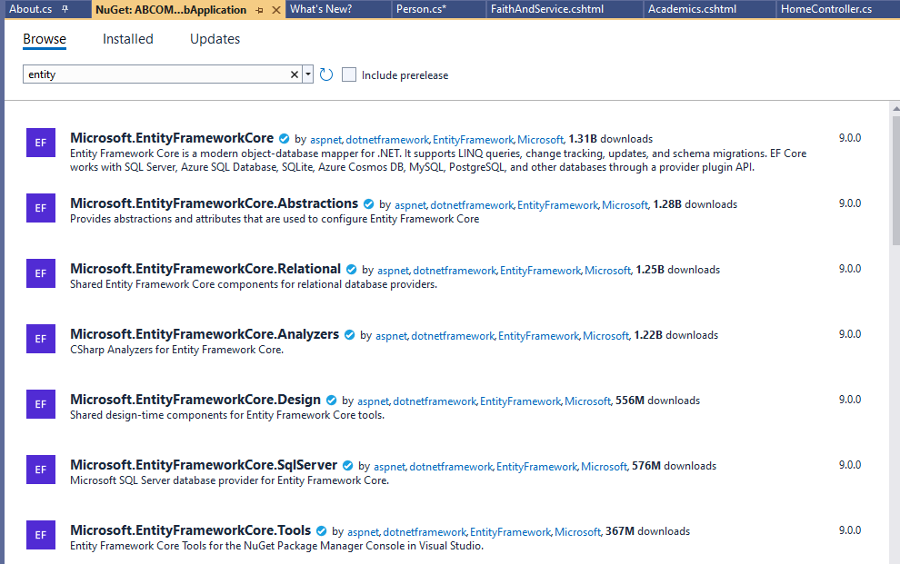 Rick Anderson, Jon P. Smith, and 28 contributors. “Part 4, add a model to an ASP.NET Core MVC app,” July 29, 2024. https://learn.microsoft.com/en-us/aspnet/core/tutorials/first-mvc-app/adding-model?view=aspnetcore-9.0&tabs=visual-studio