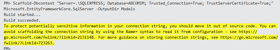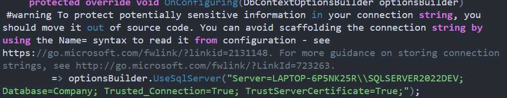Figure 15.74 The warning message in the OnConfiguring block (Source of image: https://dotnettutorials.net/lesson/asp-net-core-mvc-with-ef-core-db-first/)