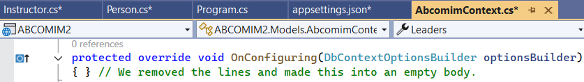 In Figure 15.69, there was a warning message. This message was placed toward the end of the ABCOMIM2.Models.AbcomimContext.cs file. See Figure 15.74.