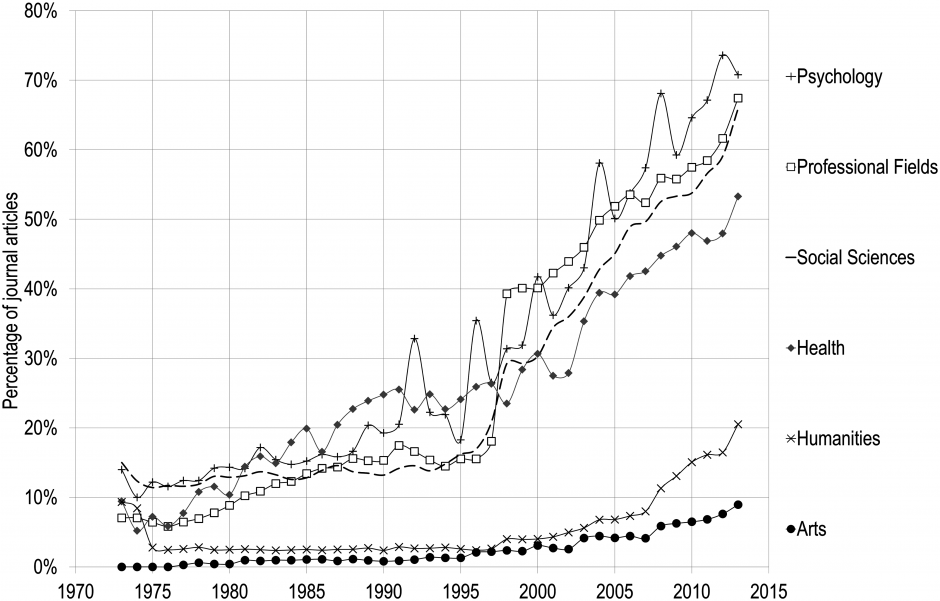 Percentage of papers published by the five major publishers, by discipline in the Social Sciences and Humanities, 1973–2013. Retrieved from Larivière, V., Haustein, S., & Mongeon, P. (2015). The oligopoly of academic publishers in the digital era. PLOS ONE10(6), e0127502. https://doi.org/10.1371/journal.pone.0127502.