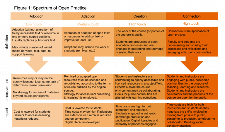 Connection is the application of open practice and extends beyond the use and creation of OER to connecting with communities beyond the classroom. Open pedagogy is an umbrella term that is often used in this area to describe the application of open strategies to the social practice of teaching and learning.