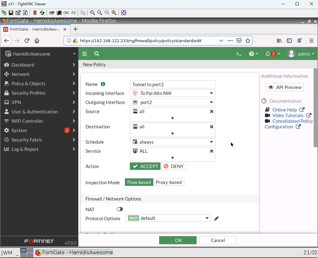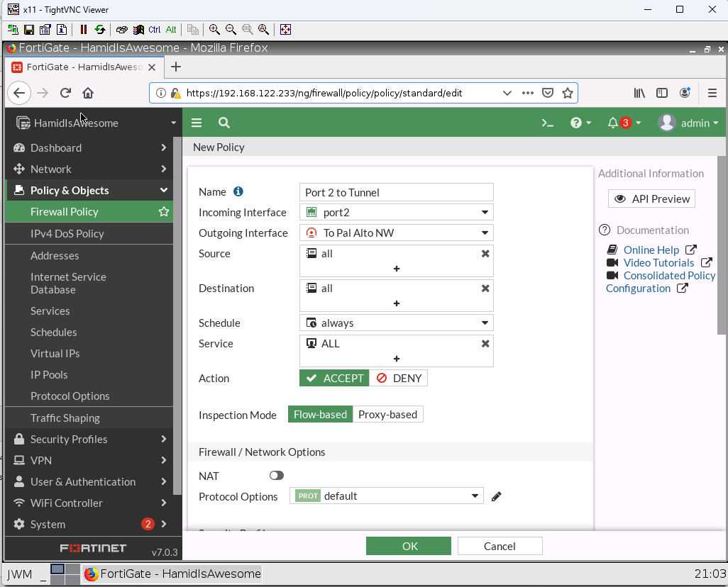 3. Create a Security IPV4 Policy from Tunnel to Port2 and from Port2 to Tunnel and allow all traffic (NAT should be disabled)