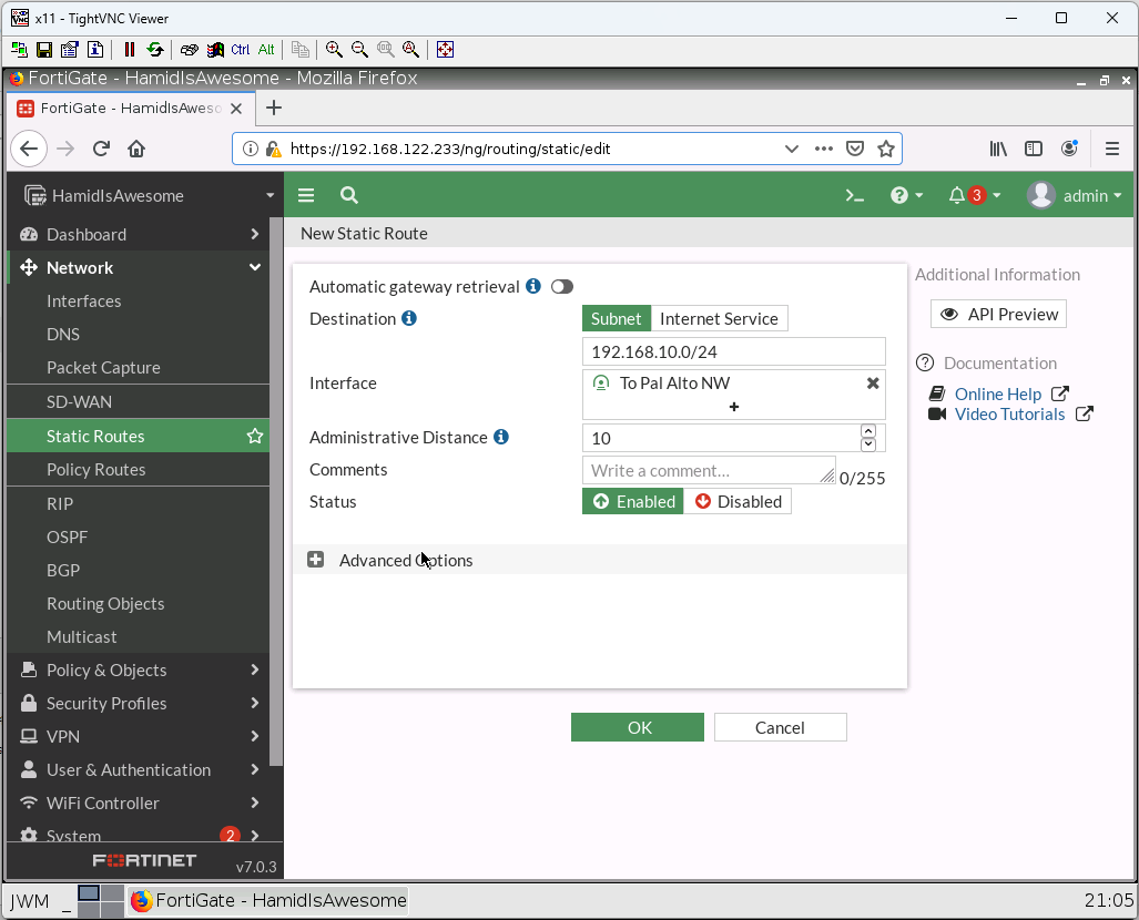 2. Create a static route with following information: