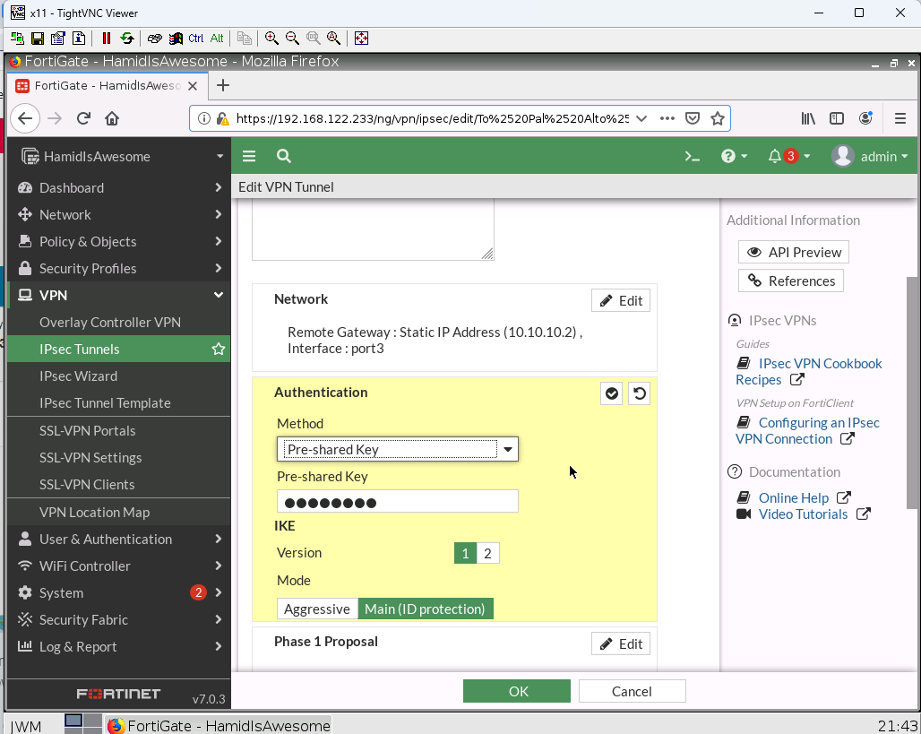 7. Create an IPSEC tunnel with following information: