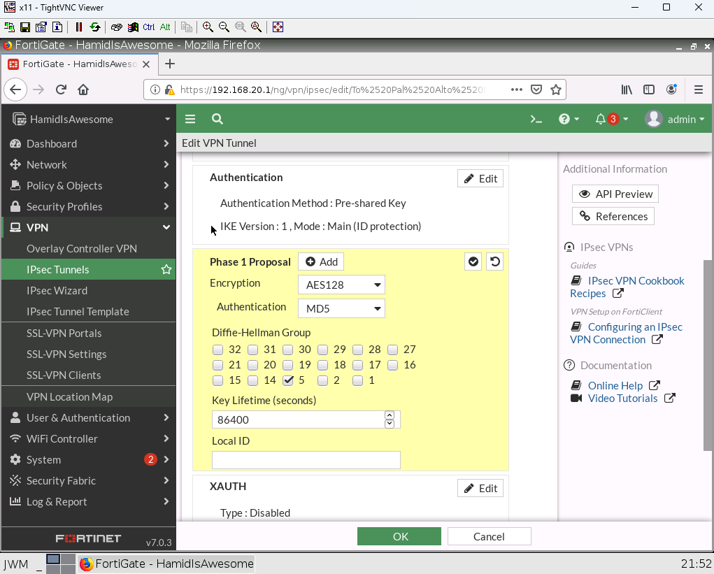 Encryption: AES128 Authentication: MD5 Group: 5