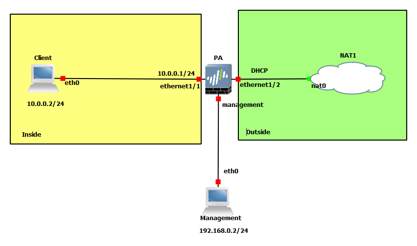 | PaloAlto | Ethernet1/1: 10.0.0.1/24 Ethernet1/2: DHCP Management: 192.168.0.1/24 |