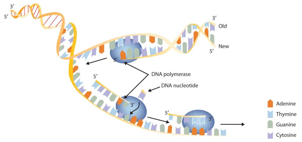 Schematic Diagram of DNA Replication. DNA replication occurs by the sequential unzipping of segments of the double helix. Each new nucleotide is brought into position by DNA polymerase and is added to the growing strand by the formation of a phosphate ester bond. Thus, two double helixes form from one, and each consists of one old strand and one new strand, an outcome called semiconservative replications. (This representation is simplified; many more proteins are involved in replication.) - ·