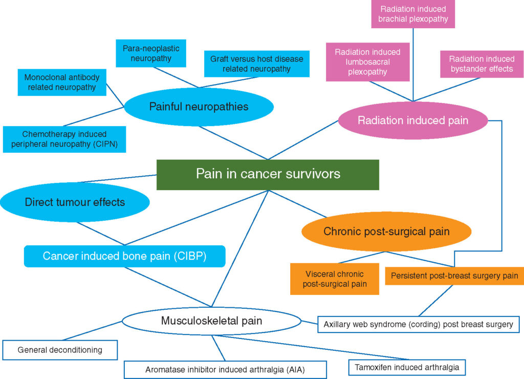 An outline of the different causes of pain in patients surviving cancer, related both to the disease itself, and the oncological treatment. -
