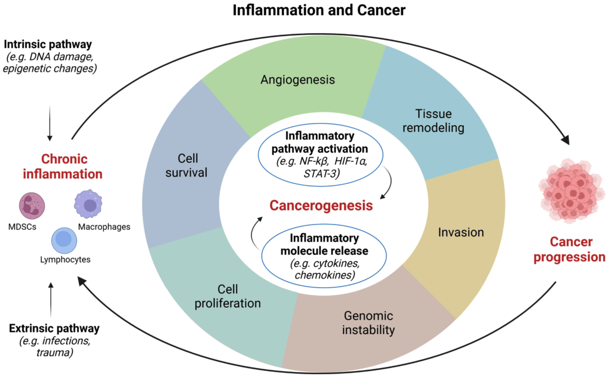 Correlations between inflammation and cancer. HIF, hypoxia inducible factor; NF, nuclear factor; STAT, signal transducer and activator of transcription. Image created with BioRender.com (accessed on 1 December 2022). -