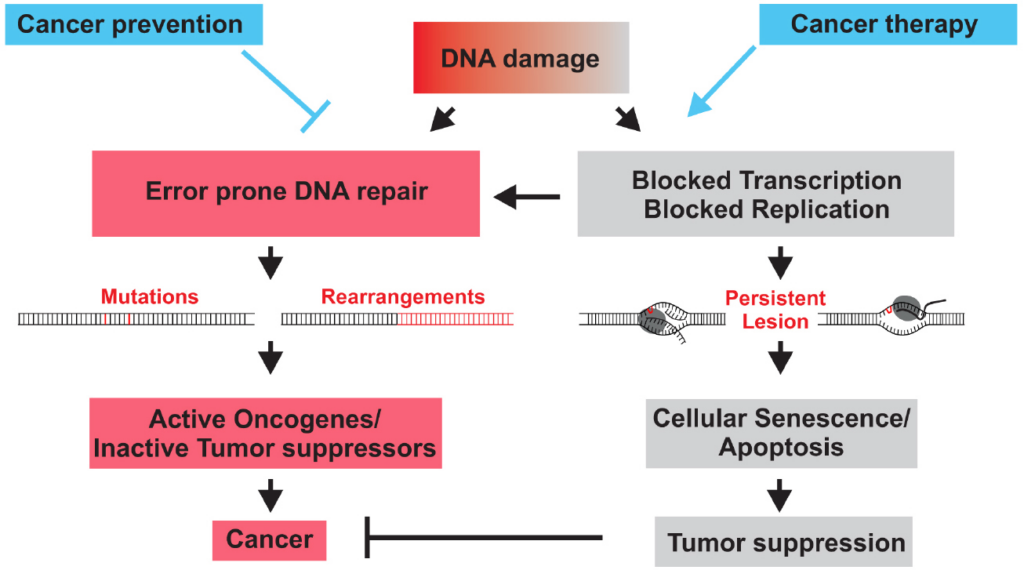 DNA damage causes cancer development when erroneous DNA repair leads to mutations of chromosomal aberration that activate oncogenes or inactivate tumor suppressors genes (red). - `