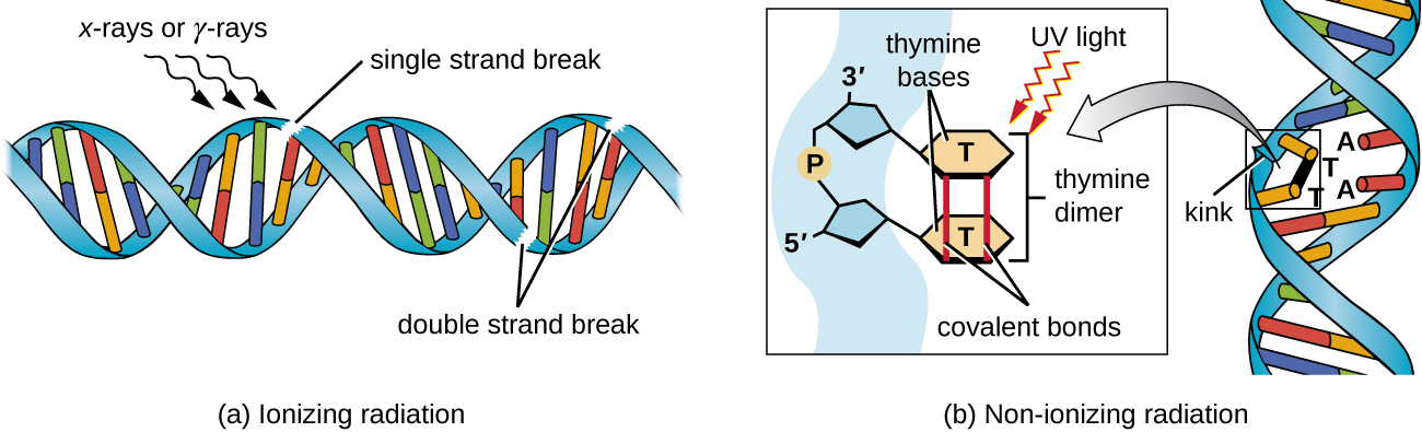 DNA mutation by radiation: (a) Ionizing radiation may lead to the formation of single-stranded and double-stranded breaks in the sugar-phosphate backbone of DNA, as well as to the modification of bases (not shown). (b) Nonionizing radiation like ultraviolet light can lead to the formation of thymine dimers, which can stall replication and transcription and introduce frameshift or point mutations.