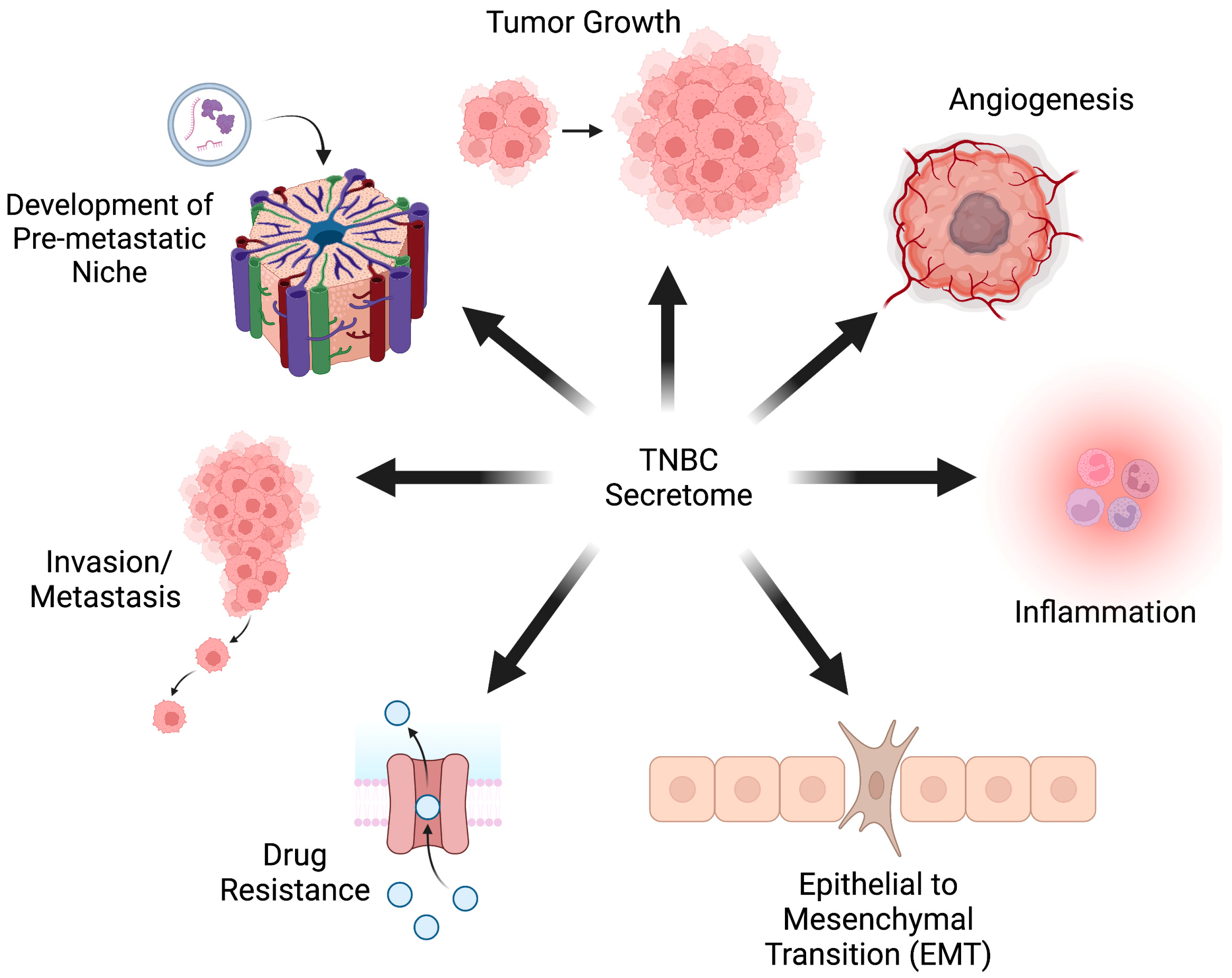 Effects of the TNBC secretome. Protein factors secreted by TNBC cells and tumors regulate cancer-promoting processes -