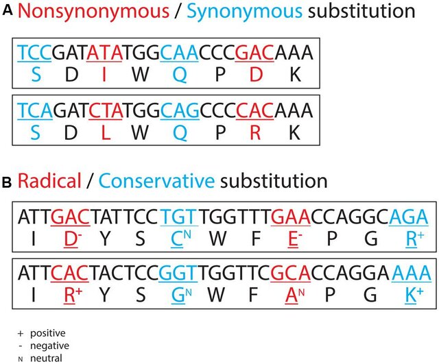 Examples of non-synonymous and synonymous nucleotide substitutions (A) and examples of radical and conservative non-synonymous nucleotide substitutions (B). In the former, a non-synonymous substitution leads to an amino acid replacement, and a synonymous substitution does not. In the latter, the 20 amino acids show different physicochemical properties, such as charge. A radical non-synonymous substitution leads to an amino acid replacement with a concomitant change in charge, and a conservative non-synonymous substitution leads to an amino acid replacement without a change in charge.