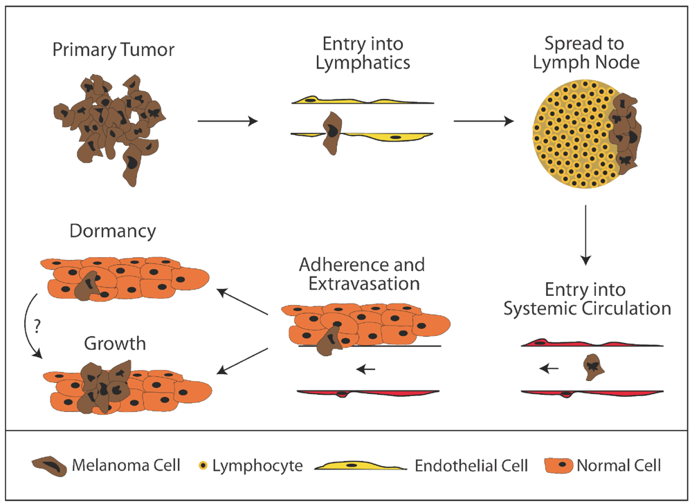 Example of lymphatic spread: Steps in Melanoma Metastasis. After formation of a primary tumor, melanoma cells are thought to enter into lymphatic vessels, traverse to the lymph node, and subsequently enter into systemic circulation via the thoracic duct. After reaching systemic circulation, cells must adhere to the microvasculature of a target organ, extravasate, and subsequently proliferate in order to form a clinically relevant metastasis. The mechanisms regulating either success or failure at any step are likely important and probably differ amongst different melanomas and different target organs.