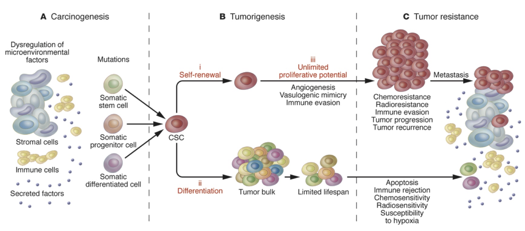 The diagram displays the responses to reduced oxygenation within the tumor microenvironment. Hypoxia promotes tumor invasion, metastasis and resistance through several ways. a Hypoxia induces detachment of tumor cells by weakening the connections between cells and their extracellular matrix supporting them, and promotes dissemination of tumor cells to the various organs of the body. Thereby hypoxia triggers the metastatic spread of tumor. b Hypoxia stimulates angiogenesis, and provides more opportunity for detached tumor cell to inter into the circulation and migrate via the newly formed vessels. Thereby hypoxia enhances invasive and metastatic spread of solid tumors to another region. c Hypoxia induces EMT, in which tumor cells detach, lose the epithelial feature, acquire a mesenchymal phenotype and display the stemness properties including loss of differentiation, tumorigenesis and aggressiveness. EMT extensively contributes to promoting of tumor cell invasion and migration. d Hypoxia up-regulates CAFs that produce the excessive altered ECM, which supports tumor growth and metastasis. e Tumor hypoxia promotes secretion of cytokines and chemokines that recruit pro-tumor immune cell and suppress anti-tumor response of various types of immune cells. f In response to hypoxia, tumor cells exploit a number of mechanisms including, extrusion of cytotoxic drug by ABC-transporters, exhibiting quiescent state, acquiring metabolic adaptations and displaying stemness features, which can contribute in chemo-, radio- therapy failure. g Hypoxia acts as a niche condition, to accumulate the CSCs enhancing tumorigenesis and resistance. EMT epithelial to mesenchymal transition, CAF cancer-associated fibroblast, ECM extracellular matrix, MDSCs myeloid-derived suppressor cells, TAM tumor-associated macrophage, TAN tumor-associated neutrophil, Treg regulatory T lymphocyte, NK cell natural killer cell, CSC cancer stem cell -