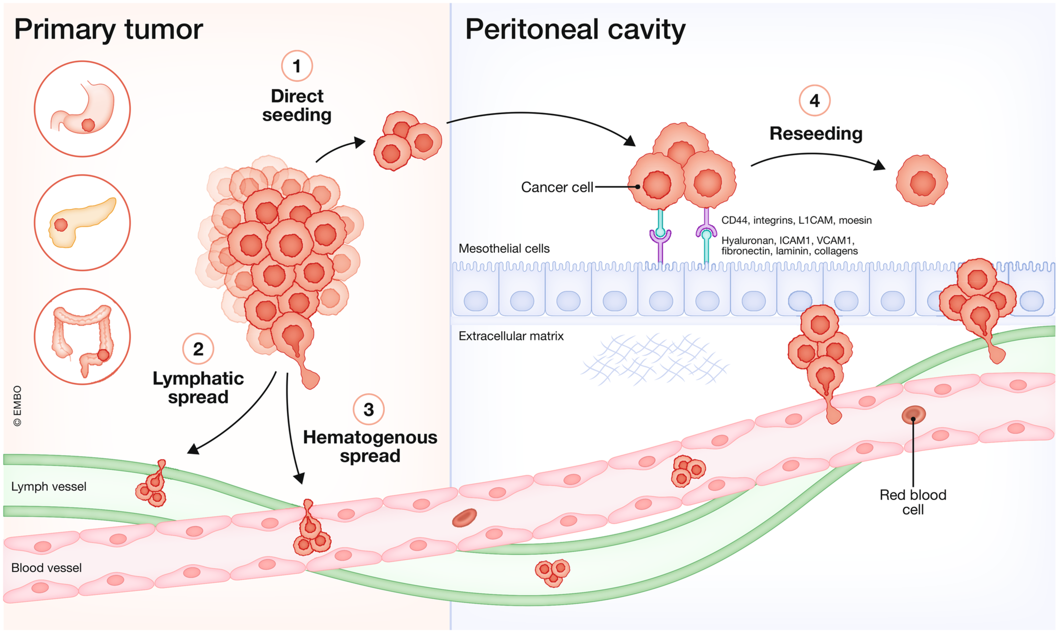 Cancer cell spread from the primary tumor to the peritoneum can occur via different routes: (1) direct seeding from the primary tumor into the peritoneal cavity, (2) via the lymphatic system, (3) via the hematogenous system, and (4) reseeding from existing PM lesions. Cancer cells interact with mesothelial cells via adhesion molecules. Created with BioRender.com. -
