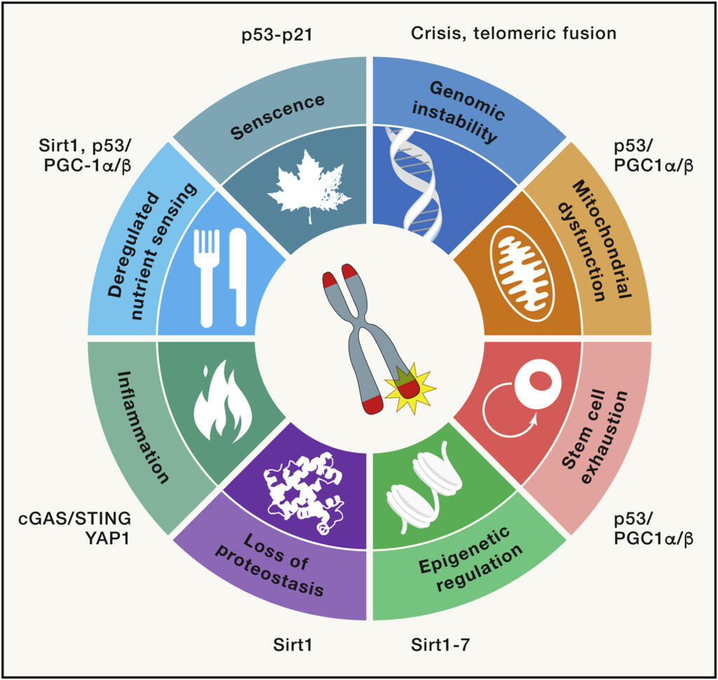 Telomere dysfunction can drive the hallmarks of cellular aging. -
