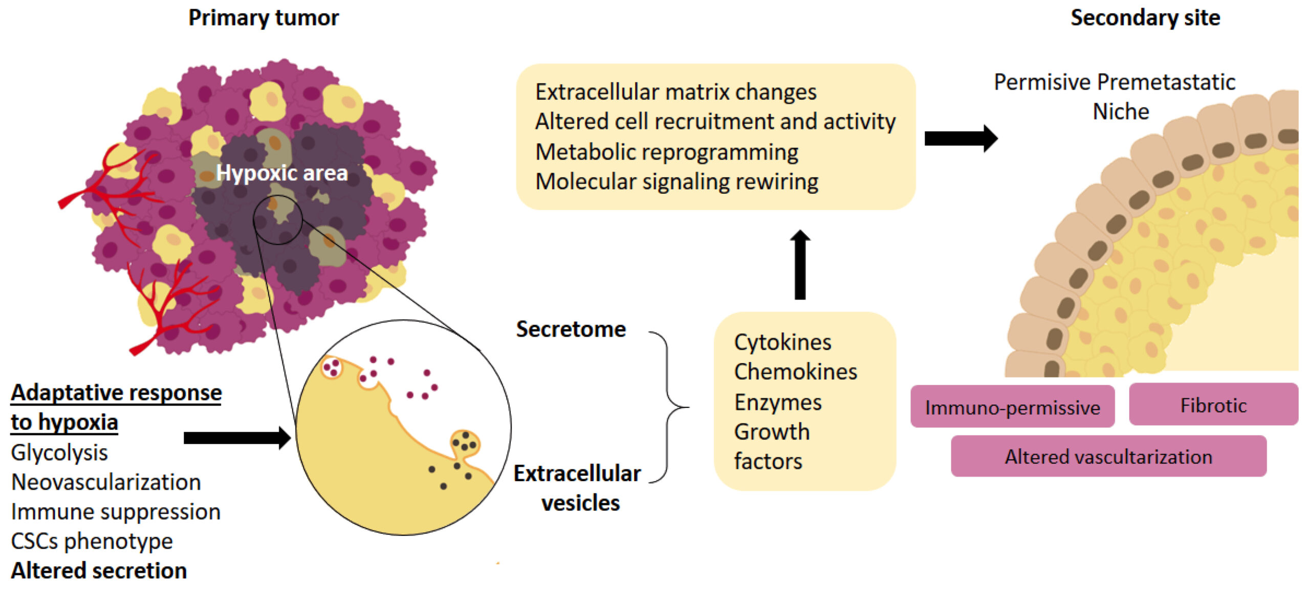 Schematic summary. As part of the adaptative response to hypoxic conditions, both tumoral and stromal cells alter the secretion of free molecules and extracellular vesicles, which upon arrival at the secondary site promote a series of changes that result in a permissive premetastatic niche.