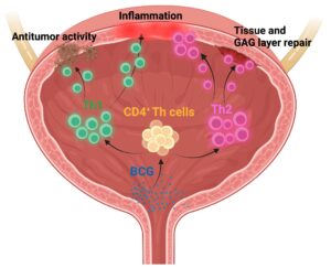 T helper (Th) cells in BCG-induced antitumor effects and bladder inflammation and repair. Intravesical application of BCG induces recruitment of CD4+ Th cells into the urothelium. A Th1-dominant bladder microenvironment is needed for an effective antitumor response. However, BCG-induced Th1-type inflammation also promotes cystitis. In contrast, Th2 T cells are required to repair the bladder wall and to restore the glycosaminglycan (GAG) layer