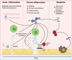 The effects of glucocorticoids change over the course of tumor development. In the pre-tumor microenvironment, glucocorticoids may protect from cancer by limiting the intensity of inflammation. Glucocorticoids suppress immune cell recruitment to sites of damage or infection and suppress proinflammatory cytokine production. However, during chronic inflammation, glucocorticoids may promote tumor development. Prolonged glucocorticoid signaling inhibits wound healing, thereby causing a feedforward loop of increased release of damage-associated molecular patterns (DAMPs), which increase inflammation and further promote tissue damage. Simultaneously, glucocorticoids suppress anti-tumor surveillance by CD8 T cells. Similarly, glucocorticoids suppress anti-tumor immunity within the tumor microenvironment and promote the expression of immune checkpoint proteins. However, their effects are compounded by increased psychological stress, exogenous steroid treatment, and local steroidogenesis by tumor-infiltrating immune cells. Furthermore, glucocorticoids may directly promote tumor cell survival by suppressing apoptosis and promoting tumor cell growth.