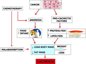 The pathogenesis of cancer cachexia is multifactorial, and includes reduced food intake, alterations in energy and substrate metabolism in the host and accelerated fat and muscle loss. - ·