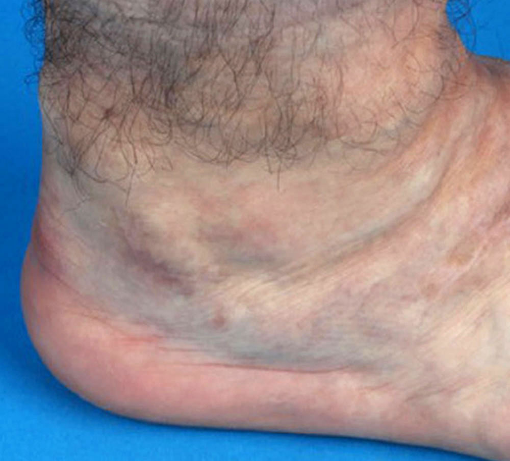 • Classic circumscribed superficial thrombophlebitis just below the lateral malleolus with reddish discoloration and swelling in a patient with venous malformation.